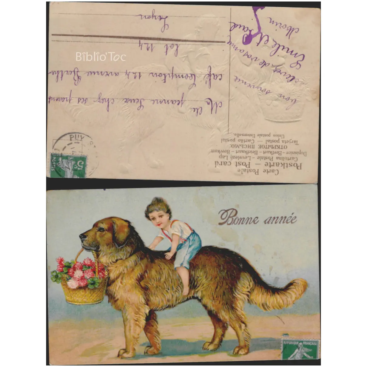 Enfant sur un chien Panier de fleurs Bonne année Gaufrée – État: Coins et bords usés Plusieurs taches