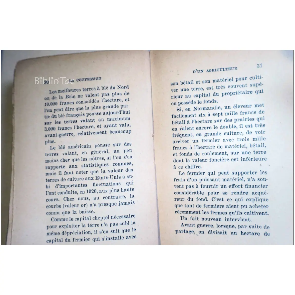 La confession d’un agriculteur – Détails: Non coupé Couverture abîmée Intérieur propre Auteur(s): Adolphe Javal – Remarques: Introuvable Agriculture
