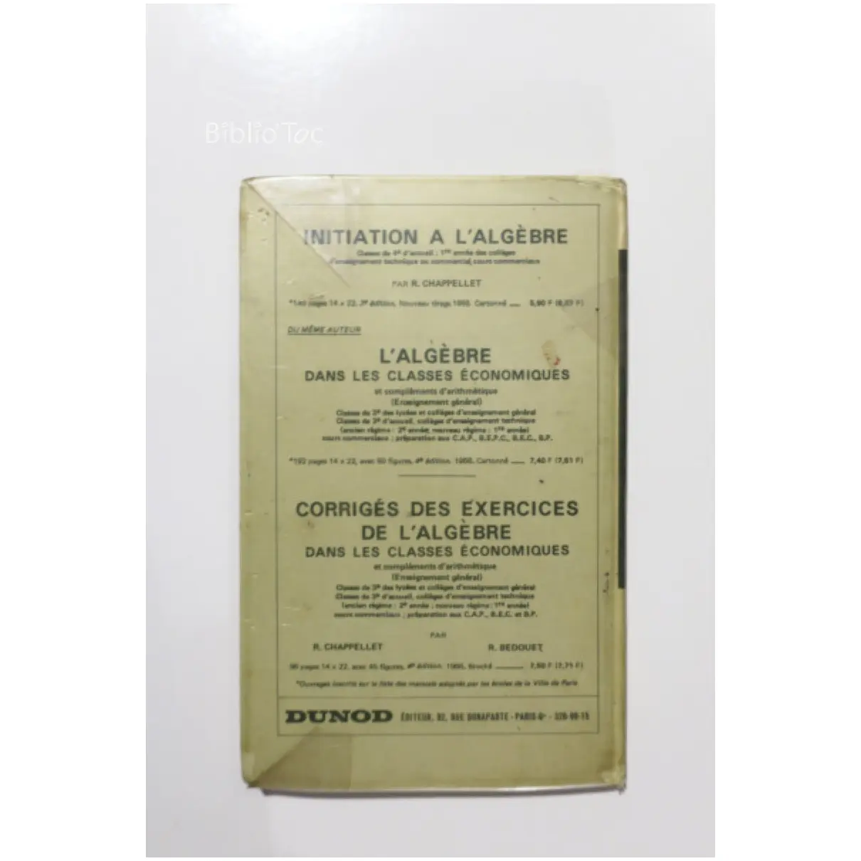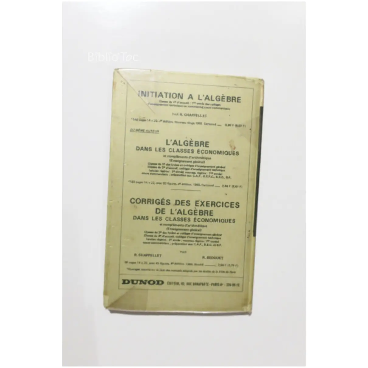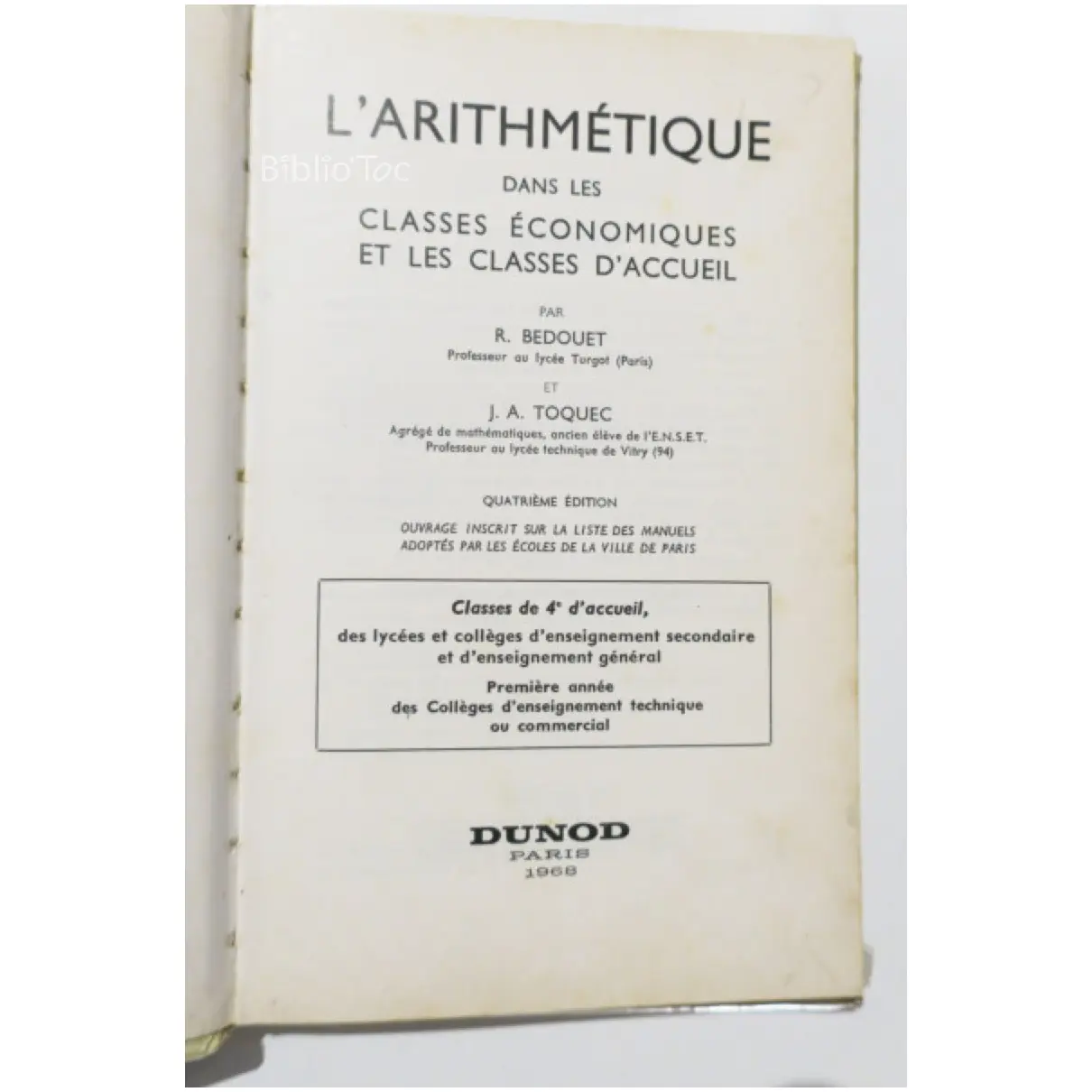 L’arithmétique dans les classes économiques et les classes d’accueil 4e – Détails: Protégé par une couverture en plastique Coins et bords usés Traces de scotch tranche jaunie Intérieur correct Auteur(s): Bedouet Toquec – Remarques: Livre peu courant Arithmétique