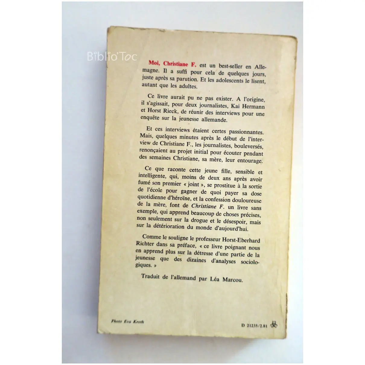 Moi, Christiane F. 13 ans, droguée, prostituée – Détails: Couverture fripée et abîmée Coins usés Bas du dos déchiré Intérieur correct Marque d’un précédent propriétaire Auteur(s): Kai Hermann Horst Rieck