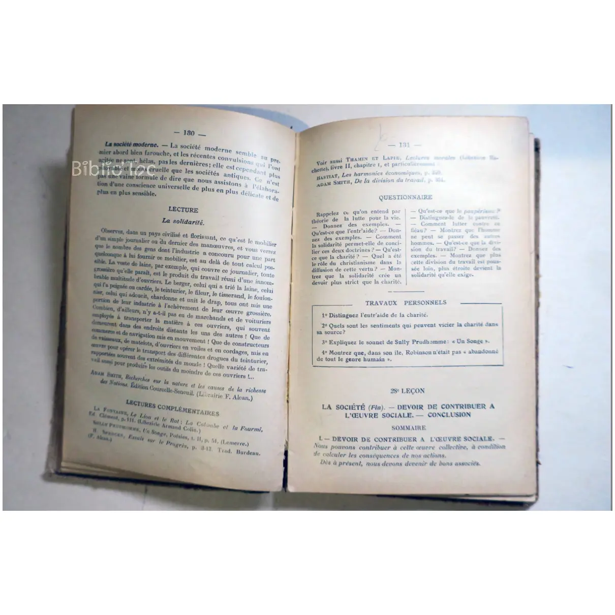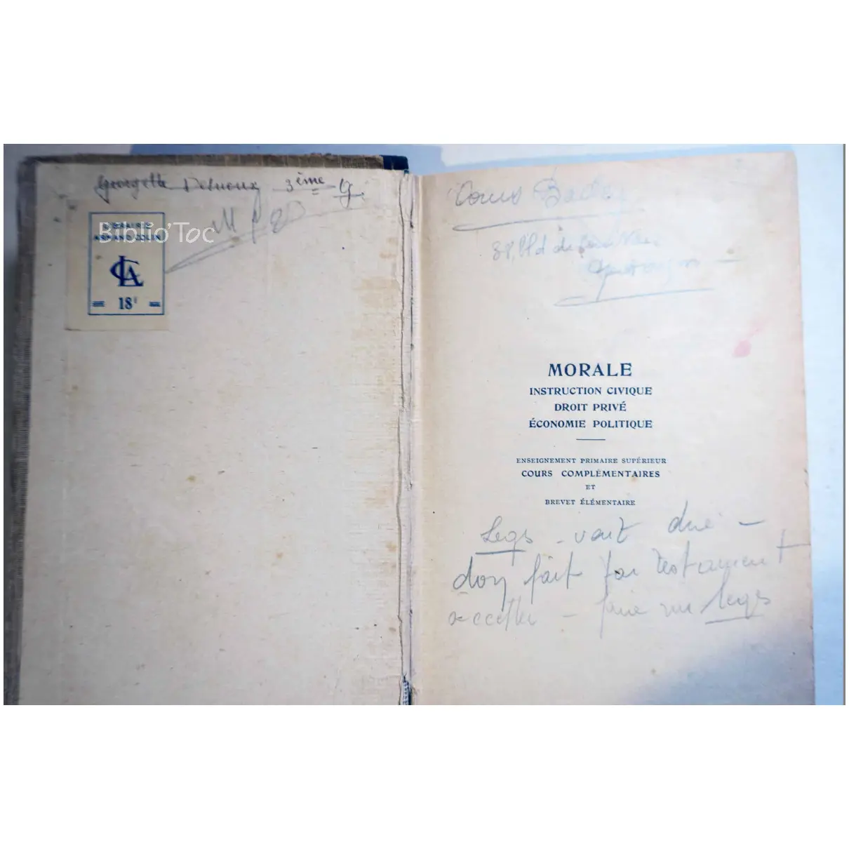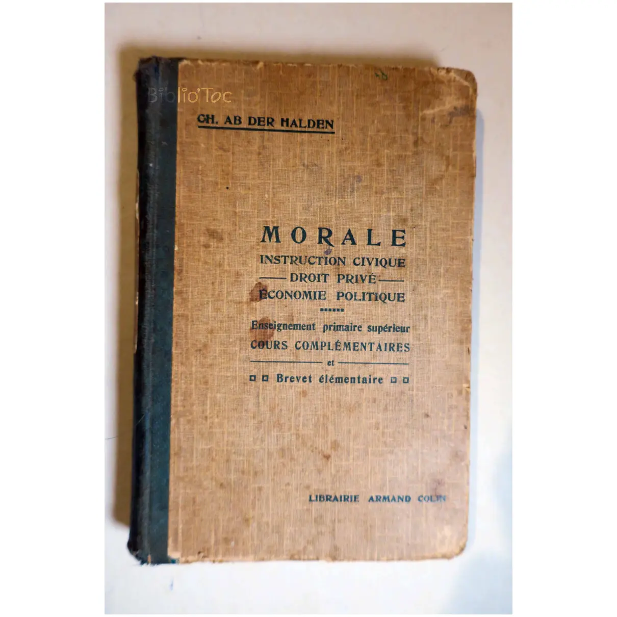 Morale Instruction civique Droit privé Economie Politique – Détails: Couverture usée et tachée Coins et bords abîmés Intérieur correct malgré quelques annotations et de rares taches Auteur(s): Charles Ab Der Halden Morale