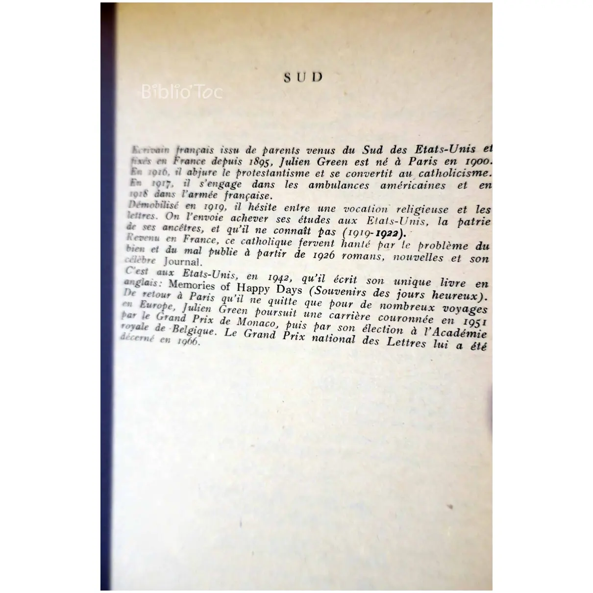 Sud – Détails: Coins frotté Intérieur jauni mai propre La dernière page (blanche) manque Auteur(s): Julien Green